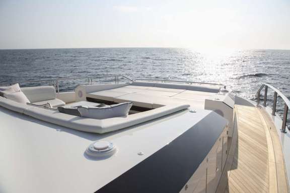 The outdoor spaces are equally impressive, with a large aft deck that is perfect for cocktails, meals, games, or lounging. The flybridge is a hub for alfresco entertainment and dining, complete with a jacuzzi and unobstructed views. The foredeck is spacious, with ample seating options and comfortable sun pads.