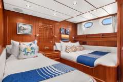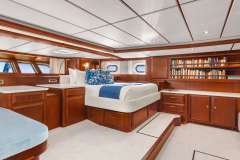 ABIDE offers three beautifully appointed guest cabins all aft of the ship. Furthest aft is the main cabin, which takes the full width of the boat at the stern, has a queen bed, daybed for lounging, full-sized desk and smart TV.Starboard side, forward of the main cabin has a double bed and a single bed.