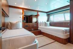 2 X DOUBLE VIP CABINS WITH ENSUITE on the lower deck, with writing desk, queen island bed, his and her cupboards, hull window, 40 inch ๏ฌat screen TV with Sat TV, Apple TVand bose lifestyle DVD / Sterio and digital safe. The port and starboard aft VIP cabinsinclude double sinks in the ensuite, Techma toilet and bidet. Sony Flat screen TV which popup in these cabins.