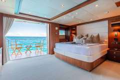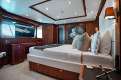 CABINS1 X MASTER CABIN AND ENSUITE on the main deck forward. King island bed, cinemas surround sound with B&O 50 inch ๏ฌat screen, Sat TV, Apple TV, and BOSE lifestyle DVD /Stereo. Study and writing desk, 2 x single seats with coffee table. Port side fold-out balcony. Timber walls, beige carpet, digital safe, electronic touchpad lighting, walk inrobe, dressing mirror, eye-level windows for a great exterior view and natural light.