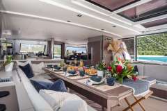Bali catamarans are known and appreciated for their unparalleled success in blending luxury, space, and performance; producing a sailing experience that is unparalleled. This new design further capitalizes on that reputation with the advent of the "Bali garage door" that is the centerpiece of the yacht. It allows for the aft wall of the yacht to simply disappear, opening up the back of the yacht to an unobstructed view of paradise. This also affords indoor/outdoor dining options and gives the ever-present Caribbean breeze ample opportunity to make its way through the yacht with ease.