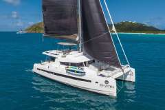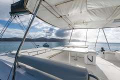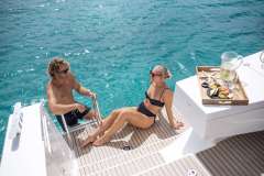 With her solid foredeck gone are the forward trampolines, replaced by a large relaxing lounge area complete with cushions for sunbathing. A full-sized door provides access directly from the lounge area into the salon, allowing free movement through the yacht. A walk up to the flybridge unveils a seating area perfect for cocktails and taking in sunsets. There is also another area for sunbathing on the flybridge where you can take in the sights of the islands from the highest vantage point on the yacht.