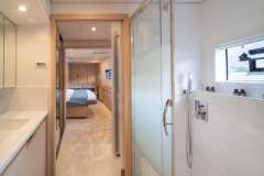 Her interior is stunningly modern and incredibly spacious, ensuring the utmost in comfort and luxury. She accommodates up to eight guests in four cabins, including one owner’s suite and three queen-bed cabins, each with a private bathroom. The flybridge and forward deck provide ample space for sunbathing and relaxation, while the aft cockpit is ideal for socializing and alfresco dining.