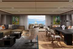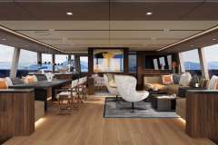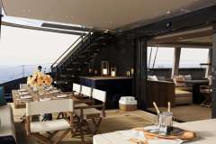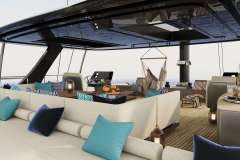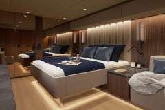 The expansive main saloon is designed for both entertainment and relaxation, with a refined dining area, a state-of-the-art barista station, and an inviting lounge with panoramic views. The master suite is a serene retreat, boasting a king-sized bed, a spa-inspired en-suite bathroom, and a private Hammam for ultimate rejuvenation.
