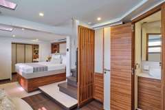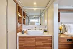 Inside, you'll find a strikingly modern and incredibly spacious interior that exudes comfort and luxury at every turn. The yacht boasts a total of five cabins, including a lavish owner's suite, and four queen-sized cabins, all of which come with their own private bathrooms and a galley down. This ensures that every guest on board enjoys the utmost privacy and convenience.