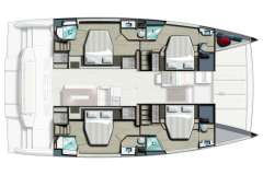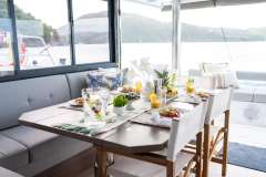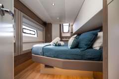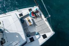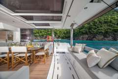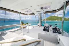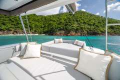 With her solid foredeck gone are the forward trampolines, replaced by a large relaxing lounge area complete with cushions for sunbathing. A full-sized door provides access directly from the lounge area into the salon, allowing tree movement through the yacht. A walk up to the flybridge unveils a seating area perfect for cocktails and taking in sunsets. There is also another area for sunbathing on the flybridge where you can take in the sights of the islands from the highest vantage point on the yacht.