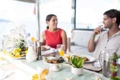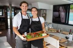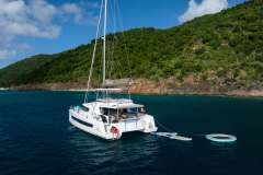 Alora will accommodate 6 charter guests in 2 spacious master cabins and 1 queen cabin, each with their own separate shower and head. She has solar panels, air conditioning, water maker, ice maker, full sized refrigerator, fully customizable menu, ecofriendly and reef safe toiletries, a bar stocked to guest preference, coffee/espresso machine, rendezvous scuba diving, snorkeling gear, underwater scooters, subwing, wakeboard, stand up paddle board, towable water tube, 10 ft. floating dock, pool noodles, fishing gear, board and card games, television in the salon, Fusion 3 Bluetooth enabled sound system and Alora giveaways.