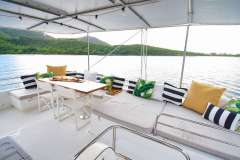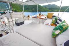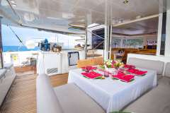 Under new management, Altesse is a beautiful Lagoon 560 available for charter in the Virgin Islands. She accommodates up to 8 persons in three separate Queen State Rooms plus one Luxury Master Suite. The yacht is bright and spacious, with comfortable interior and exterior lounging and dining spaces; multiple relaxation areas for guests to relish some peace and quiet, as well as space to enjoy time together as a group. Her exclusive signature features are her custom-built ‘champagne lounge’ extending over the water and a full-bimini covered flybridge dining table to enjoy cocktails and canapés whilst taking in the stunning 360 degree scenery.