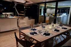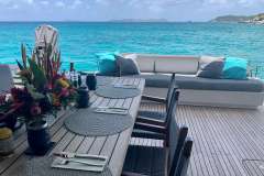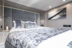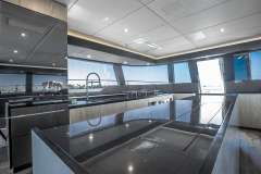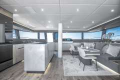 This galley up version features a spacious cockpit for dining, which opens onto an expansive aft deck with panoramic views. The foredeck holds additional entertainment spaces with sunken seating, sunpads, and trampolines, easily accessible through the salon or along the outside. The covered flybridge with table provides another generous vista point, and is an ideal place for lounging and enjoying a cooling cocktail.