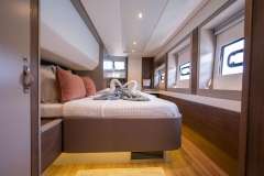 With her solid foredeck gone are the forward trampolines, replaced by a large relaxing lounge area complete with cushions for sunbathing. A full-sized door provides access directly from the lounge area into the salon, allowing free movement through the yacht. A walk up to the flybridge unveils a seating area perfect for cocktails and taking in sunsets. There is also another area for sunbathing on the flybridge where you can take in the sights of the islands from the highest vantage point on the yacht.