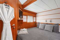 Four Staterooms consist of 1 Master, 1 VIP and two twins, each with an additonal pullman. All cabins have ensuite bathrooms.The master stateroom features a large walk around king size bed and a large closet with a built in safe. The master has plenty of storage and a small sitting area comfortable for two. The ensuite features his and hers basins and a large walk-in shower.