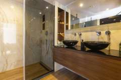 She combines a supreme yachting experience with accommodation for up to 20 guests. Her ten double cabins sit four on the lower and six on the main deck, the cabins range in size between 22 and 28m2, each with a king-size bed, en suite bathroom and walk-in closet. To accommodate single guests or guests with children, four of ten cabins can be converted into twins. Smart TVs, plug-ins for gadgets, and Intercom are featured in all cabins.