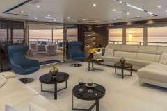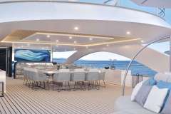 Guests can savor Mediterranean specialties by their Chef in the interior or sundeck dining area. The interior dining lounge on the upper deck features two tables seating ten persons each, but also cozy lounging sets ideal for aperitifs over mesmerizing views through panoramic windows.