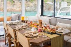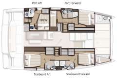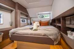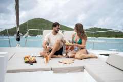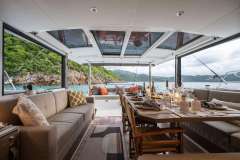 With her solid foredeck gone are the forward trampolines, replaced by a large relaxing lounge area complete with cushions for sunbathing. A full-sized door provides access directly from the lounge area into the salon, allowing free movement through the yacht. A walk up to the flybridge unveils a seating area perfect for cocktails and taking in sunsets. There is also another area for sunbathing on the flybridge, where you can take in the sights of the islands from the highest vantage point on the yacht.