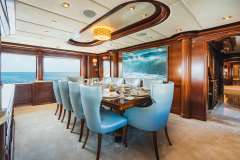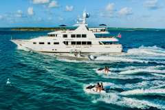 maple burl inserts throughout. She has zero speed stabilizers and a shallow draft for her size making her and excellent Bahamas and New England cruising choice. Her owner has enjoyed decades of charter yacht ownership and upon purchase; they completed an extensive refit to ready her for charter. The complete interior was updated as well as exterior improvements, additions, and many audio-visual upgrades. The flybridge was designed and reconfigured specifically for charter guest’s enjoyment. There is a beautiful Jacuzzi area as well as sun beds, full bar and entertainment as well as aft lounging area with umbrellas for shade and total relaxation. Below the flybridge on the sky lounge deck there is a massive round table for dining and comfortable furniture aft for lounging. The sky lounge is a comfortable and happy space and offers a game table, the perfect spot for movie watching and full bar. The main salon features formal dining forward and aft salon area that includes an entertainment system. Aft of the salon is a spacious deck area with dining option and access to the expansive swim platform. Underway the 2 wave runners are stored here and once at anchor they are in the water along with an extensive list of other toys and ready to go for guest’s enjoyment.