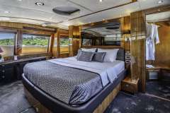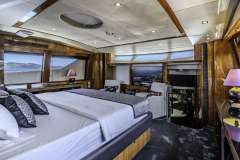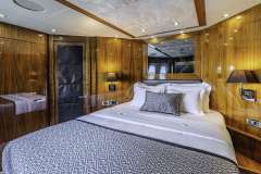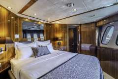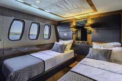 ARAGO accommodates up to 10 guests in 5 staterooms. The main deck master stateroom provides 180-degree visibility and features a walk-in wardrobe and steps down to a sunken open plan en suite with a luxurious bath/Jacuzzi and separate steam shower room. Located on the lower deck are two generous-sized VIP staterooms with double beds, en-suite with his and hers sinks, and a large shower with seating. Two twin en-suite staterooms (convertible) where one twin cabin has the ability to place an additional extra bed on the cabin floor (ideal for a child)Cabin arrangement of ARAGO?