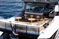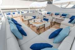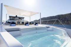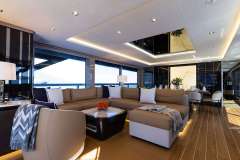 Floor to ceiling windows and doors surround the main deck salon allowing guests to feel as if they are outside while protected indoors when needed. The formal dining seats 8 guests while the aft and flybridge dining, in true al fresco style will seat more, especially lending shade cover overhead as well. In addition to the lounge area on the flybrdge aft combined with high top bar, guests have an equally as large al fresco dining, sunning and Jacuzzi area forward with shade option.