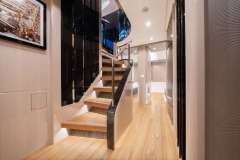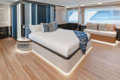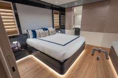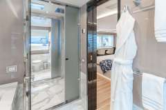 On deck Master Stateroom forward with a large walk in shower with steam feature. Long concealed hanging closets for guests.