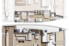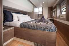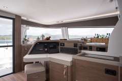 With her solid foredeck gone are the forward trampolines, replaced by a large relaxing lounge area complete with cushions for sunbathing. A full - sized door provides access directly from the lounge area into the salon, allowing