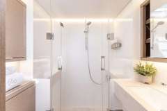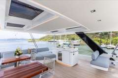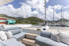 Available for charter in the British Virgin Islands, we provide luxury accommodation for up to 8 guests in 4 spacious VIP cabins (1 King, 3 Queens). We are the only model with a custom-enlarged Owner's cabin King bed, and double-sized shower for your comfort. Featuring spacious cabins, dining areas both in the cockpit and enormous flybridge, boasting 2 bars, numerous sunning spots (or shade!) and dual helm stations, this really is a masterpiece yacht. On board, you'll indulge in exquisite culinary creations crafted by our chef, paired with expertly crafted cocktails prepared by our skilled stewardess.