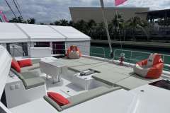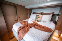 With her solid foredeck gone are the forward trampolines, replaced by a large relaxing lounge area complete with cushions for sunbathing. A full-sized door provides access directly from the lounge area into the salon, allowing free movement through the yacht. A walk up to the flybridge unveils a seating area perfect for cocktails and taking in sunsets. There is also another area for sunbathing on the flybridge where you can take in the sights of the islands from the highest vantage point on the yacht.