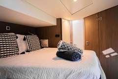 The traditional forward trampolines have been replaced with a spacious lounge area outfitted with cushions for superior sunbathing and relaxation. A full-sized door connects this lounge area to the salon, ensuring effortless movement throughout the yacht. The flybridge features a seating area perfect for enjoying cocktails and sunsets, as well as a sunbathing spot offering panoramic views from the yacht’s highest point.