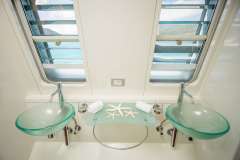 #1 Master Cabin (stbd aft) is a UK king size bed with own bathroom, two sinks, one shower, and toilet.#2 Port aft, and #3 port forward cabins are mirrored cabins with a UK king bed that can split into two single beds, each with own bathroom.
