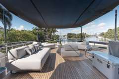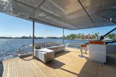 The stunning and sleek Riva 90 Argo, BEYOND BEYOND is an eye-catching yacht offering both excellent performance and impressive volume. She is beautifully designed by Officina Italiana Design in partnership with the Ferretti Group. Ideal for a couples getaway or a family vacation she sleeps 6-8 guests in 4 staterooms. Her elegant interior is highlighted by full length side windows that open up on to the walk around deck either side, allowing guests to embrace the ocean breeze. Forward of the dining table which seats eight, you will find the full beam owner’s suite, featuring a king size bed and comfortable lounge area. The ensuite features a double vanity and a spacious shower. The large windows throughout the suite offer natural light and a beautiful view. A full-beam VIP suite and two queen staterooms are located on the lower deck, each with en-suite bathrooms. . The social hub of the yacht is found on the flybridge where entertainment is key, featuring a wet bar, dining and lounging with a view of the stars through a retractable awning. Join our professional crew onboard and experience a trip that will take you ‘BEYOND BEYOND’ your imagination.