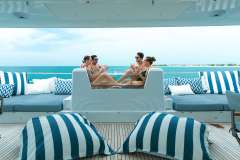 The expansive flybridge is one of the most popular areas on BLESSED. It features 2 refrigerators, 2 ice makers, a wet bar and a 55” smart TV. With multiple locations for sunbathing or enjoying the shade, this space is designed for ultimate relaxation (and the occasional dance party)! It is also the ideal spot for taking in the spectacular underway views. The jacuzzi will bubble away any remaining cares that you may have.