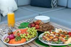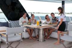 BLESSED offers a spacious and luxurious feel normally only found aboard Motor Yachts of the 130’ range. The open main salon, with galley up layout, creates a friendly and inviting atmosphere. Perfect for relaxing and socializing. The aft deck, with seating for up to 10, is ideal for memorable alfresco dining and conversation. It is complimented with an ice maker, 2 refrigerators and chilled filtered water for your convenience.