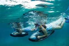 Water sports are a significant part of the BLESSED experience. The Yacht’s Toy Garage easily deploys into the water, providing effortless access to exciting adventures with the eFoil’s or SeaBobs! The hydraulic platform also lowers, getting you close to the Water’s Sky Blue Edge. Relax on a lounger or slip in for a snorkel. Or, enjoy a refreshing cocktail on the 10’ inflatable pool deck. Casual SCUBA diving is always an exciting option.