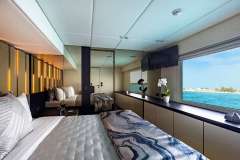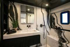 Four of the guest cabins are accessed through the main salon. Each one has a European King Bed and are equally appointed with the finest, most comfortable bedding. The en-suite bathrooms boast the most elegant rain showers imaginable. The Fifth Guest Cabin is accessed from the port aft deck. It is appointed with a double bed and an en-suite bath with rain shower.