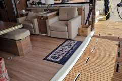 Fridge on flybridge. Cushioned solarium with with handrails. Safe access with wide steps. Handrails along the entire stretch. Padded cockpit Console with engine panels. Plotter and navigation electronics displays.