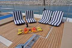 Fully rigid teak bow cockpit with full rigidity. Sunbathing mattresses