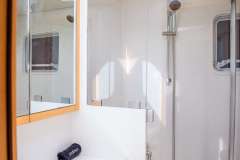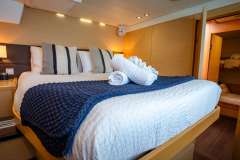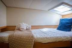BlueWinds features 4 guest suites, 3 with queen berths, 1 with twin bunks, all with full A/C and ensuite toilet and shower. Twin cabin has a wet head.Crew will take port aft queen cabin