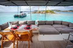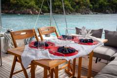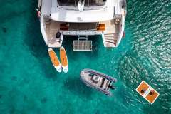 No expense was spared in outfitting this gorgeous luxury sailing yacht which offers four guest cabins (for 8 guests), each with their own private bathroom, a salon with 360 degree windows, 2 dining areas and a foredeck sitting area. Amenities and toys include TVs in each cabin, 2 trampolines, a 15-foot tender for wakeboarding, tubing or zipping to gorgeous beaches, 2 standup paddleboards, 1 double kayak, a hydraulic swim step for easy water access, and snorkeling and diving gear. Bluewind’s elegant yet minimalist design provides the handling of a performance sailing catamaran while offering the ambience and amenities of a world class resort on the water. Spacious design of the cockpit and flybridge areas offer guests panoramic vistas, al fresco dining and ample space for lounging, whether in sun or shade.