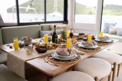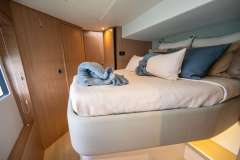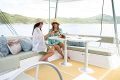 With her solid foredeck gone are the forward trampolines, replaced by a large relaxing lounge area complete with cushions for sunbathing. A full-sized door provides access directly from the lounge area into the salon, allowing free movement through the yacht. A walk up to the flybridge unveils a seating area perfect for cocktails and taking in sunsets. There is also another area for sunbathing on the flybridge where you can take in the sights of the islands from the highest vantage point on the yacht.