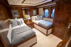 CAMILLE accommodates up to 10 guests in 5 spacious cabins. On deck King Master with private His and Hers head on the forward main deck. On the lower deck, VIP stateroom has a king berth with private bath, shower and tub. There are two identical guest staterooms with queen berths and a fifth stateroom with twin beds. All with en suite heads.Cabin arrangement of CAMILLE?