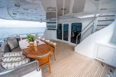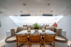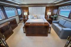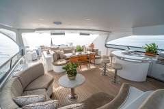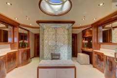 Live the dream on the 124’, five stateroom CAMILLE- where timeless opulence meets modern style. Her oversized main salon windows highlight the beautiful cream and light blue interior with contrasting custom beautiful wood design. CAMILLE accommodates ten guests in five staterooms with the master full beam stateroom on deck. Forward of the master is the large master bathroom with sky lights, his and hers sides separated by a shower and full closets forward. Below midship there are four additional staterooms with various guest configurations, including a king, two queens and a twin room. CAMILLE's raised pilot house configuration leads to the best part of the yacht, the enormous fly bridge. This area provides another al fresco enjoyment spot as large as the main salon. This is the ideal enjoyment area and hangout space for everyone. Forward on the fly bridge is covered by a hard top for shade and offers seating, dining and full bar area with entertainment. Just aft there is a large Jacuzzi, sun lounges and without the normal toy storage area, the entire deck is guest enjoyment space. Aboard CAMILLE the wave runners are tucked away in the aft deck and easily accesses along with the towed tender and full list of toys. T