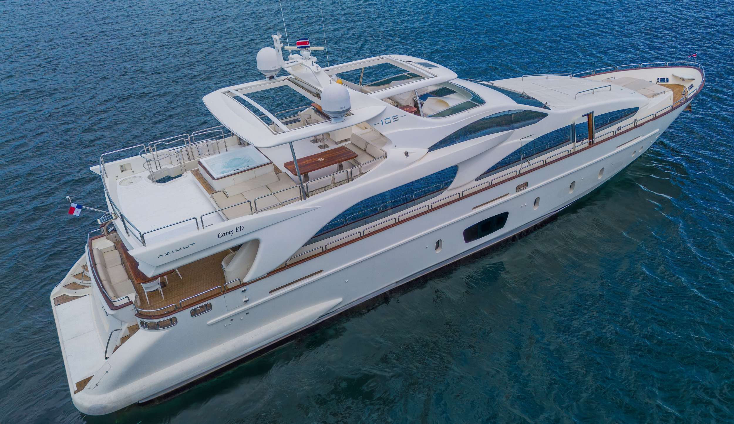 Advertised by Amwax Prime, the astonishing charter yacht CAMY ED is a 102 ft yacht featuring a hot tub. The primary distinction of CAMY ED are her generous space and alfresco dining areas. She was constructed by the renowned boatbuilder Azimut in 2006. An elegant refit was completed in 2023. The spacious yacht layout features 4 generous cabins and comfortably accommodates a group of 10 guests.