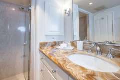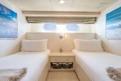 Venture up to the flybridge, where you’ll find an inviting Jacuzzi with built-in bar stools, a sun lounge, and a Bimini top, perfect for both sun-soaked and shaded relaxation. CHANSON accommodates up to 8 guests across 4 well-appointed staterooms. The on-deck VIP stateroom features large windows, a king bed, and an en-suite bath with shower. The full-beam master suite includes a king bed and private his-and-hers bathrooms, with a shower in one and a Jacuzzi in the other. Two additional guest cabins, each with spacious en-suite bathrooms, complete the accommodations—one with a full and twin bed, and the other with two twin beds.