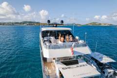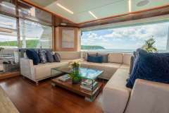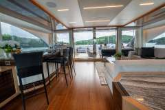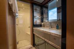 The luxurious, full beam, main deck Master stateroom offers a King size bed, large windows, a sitting area and a great deal of storage space. The master en-suite, outfitted in white and grey marble offers double sinks, a closed toilet, standing shower with bench and a jacuzzi spa.Three additional staterooms are offered on the lower deck including a Queen VIP and two convertible twin staterooms. All include en-suites with standing showers.
