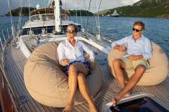 The yacht features full hydraulic sail handling with in-mast furling. The guest cockpit has a clear central walkway aft, giving access to the helm positions and side decks. There are two large cockpit tables ideal for exterior dining.