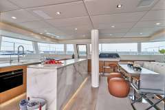 Spacious cockpit featuring a big dining table for 8, a cozy sofa, combined with a stylish and functional galley create a semi-open lounging area.