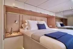 Up on the catamaran’s impressive flybridge, guests can gather for lounging and drinks on the welcoming and pampering sofas. Versatility of this area allows it to also serve as a perfect space for yoga or light exercising, all while enjoying the spectacular sea view.