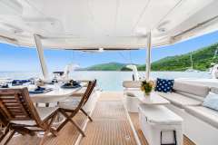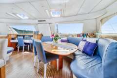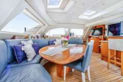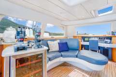 Flybridge accessed by stairs in the cockpit lead to a large lounge area with cushioned mats, beanbags, and a table for 4 for coffee or cocktails.