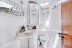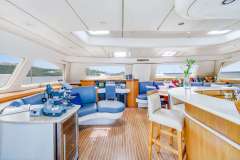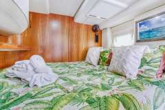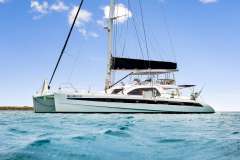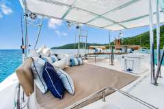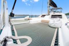 Foredeck features large deck space and trampolines with built in back rests. Cabins are large and comfortable, with more than ample storage for clothing and personal effects, and heads feature separate shower stalls.