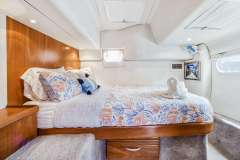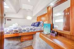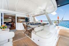 Galley down layout provides a spacious and comfortable layout, with a massive salon featuring a large dining table and seating for 8, bar with counter, sink, icemaker and fridge, and a sliding glass pass-thru to the cockpit. Spacious cockpit with dining table for 8, and open access to the swim platform.