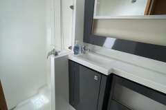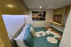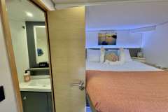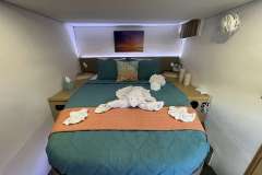 Five cabins with queen berths, each cabin has en-suite head with shower, electric toilet and vanity. Dry shower stalls in starboard and port forward cabins.Crew have their own separate shower and separate head.