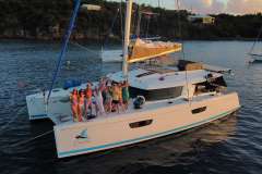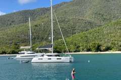 This spacious Fountaine-Pajot gem, S/V Devine Sailing, features an upper lounge with 360 degree view along with a forward deck with a spacious and comfortable seating area. The salon offers lounge area plus flat screen TV with many movies and USB capabilities. An abundance of water toys awaits our guests, including our famous “G-Swing”! Come experience the thrill of being lifted high above the water to drop, flip or scream your way down!